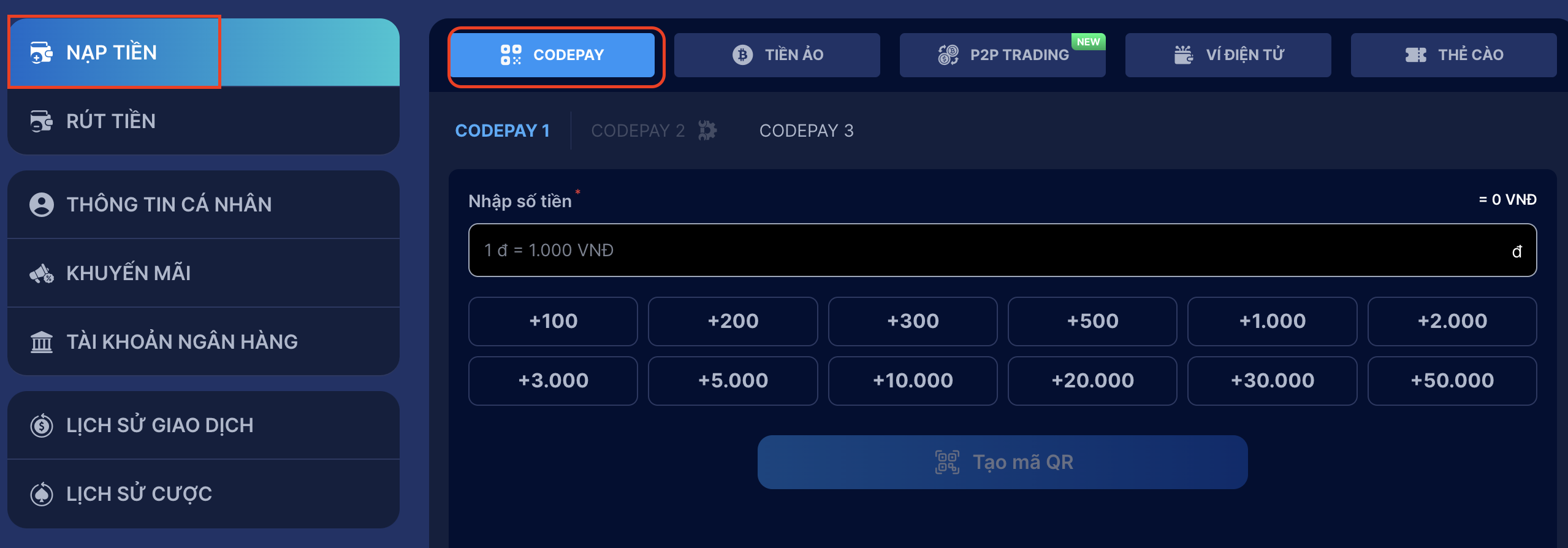 | Phương thức nạp tiền | Hạn mức tối thiểu (VND) | Hạn mức tối đa (VND) | Phí giao dịch (%) |